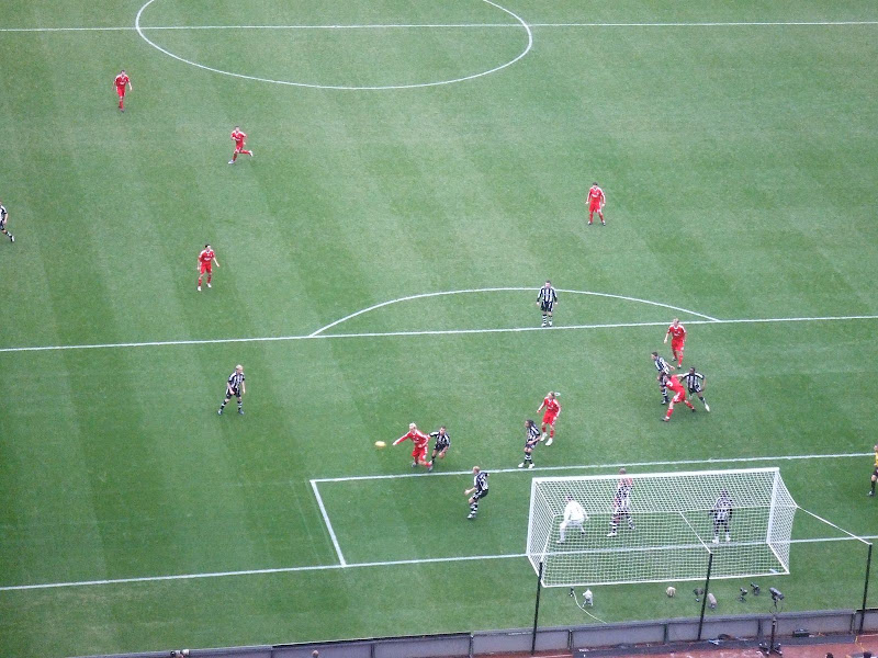 פקק ארוך בכניסה לניוקאסל מעכב אותנו ואנחנו מגיעים לסיינט ג'ייימסס פארק פחות מרבע-שעה לשריקת הפתיחה. מכיוון שכל האוטובוסים ממרסייד נתקעו באותו פקק כל האוהדים זורמים בבת אחת למגינת ליבה של המשטרה שמצליחה אך בקושי לשמור על הסדר. הדוחק בכניסות לא אופייני לאיצטדיונים באנגליה ואנחנו נכנסים באיחור כשהמשחק כבר בדקה הרביעית. היציע של אוהדי החוץ בסיינט ג'יימסס ממוקם גבוה גבוה בחלק העליון של היציע הצפוני ומשם יש אחלה נוף על העיר אבל לא ממש על הדשא..
